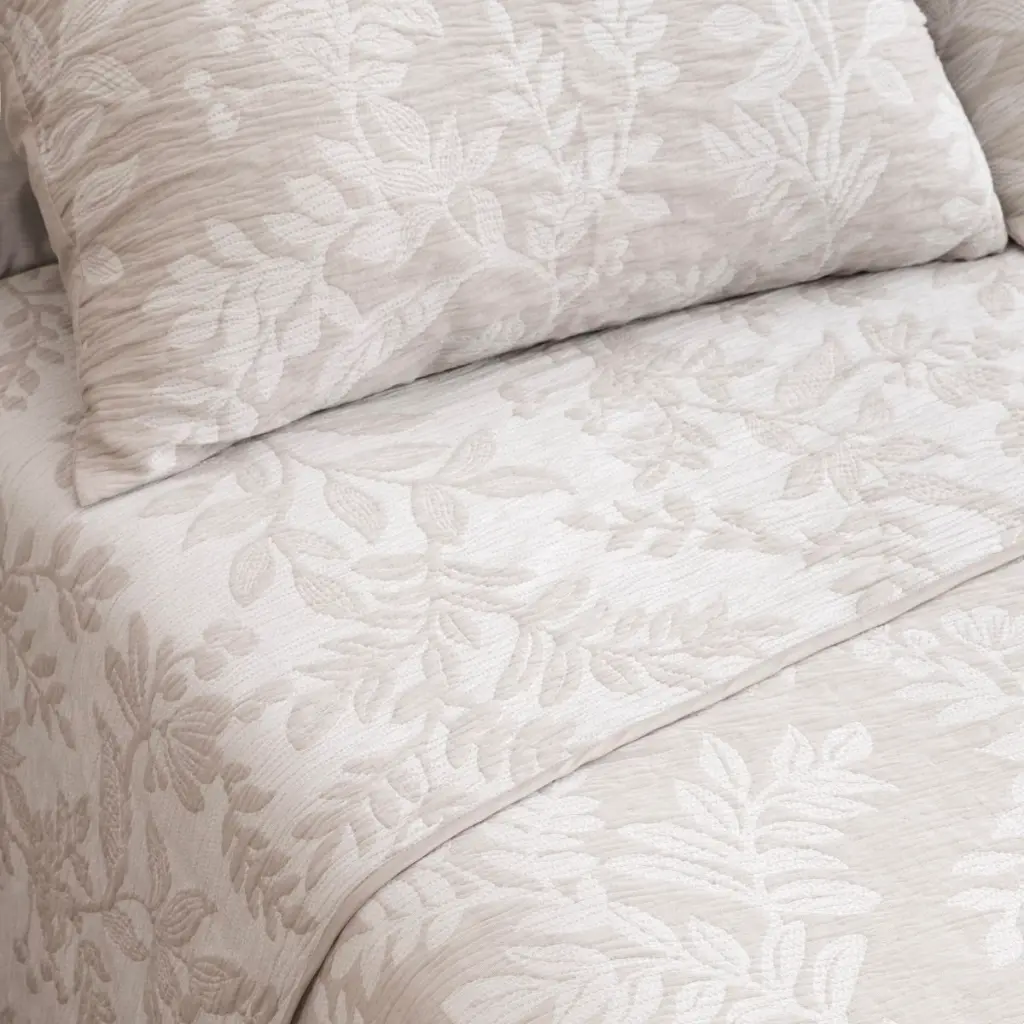 Colcha reversible Don Algodón en tejido jacquard de alta calidad, con diseño floral integrado que aporta un acabado elegante y duradero. Su gramaje de 155 g/m² la hace ligera y cómoda, ideal para entretiempo o uso durante todo el año.