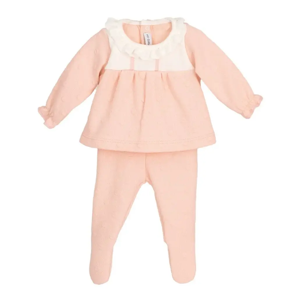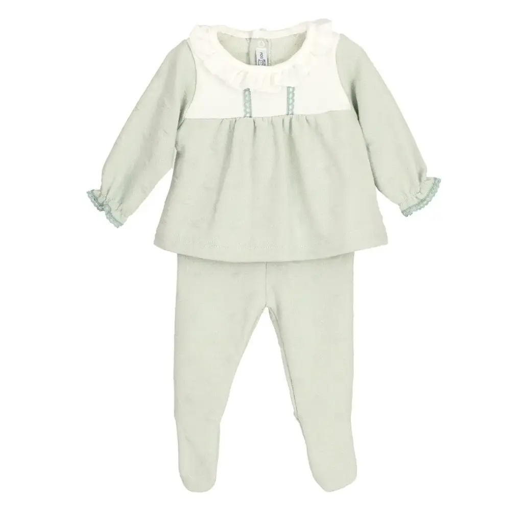 Conjunto de bebé formado por jubón de manga larga y polaina. El jubón es en color menta, con canesú blanco, cuello con volante y detalles de puntilla. La polaina es en color liso menta con pies cerrados. Cierre trasero con corchetes para vestirlo fácilmente. Es ideal para la delicada piel del bebé al ser prendas confeccionadas en 100% algodón.