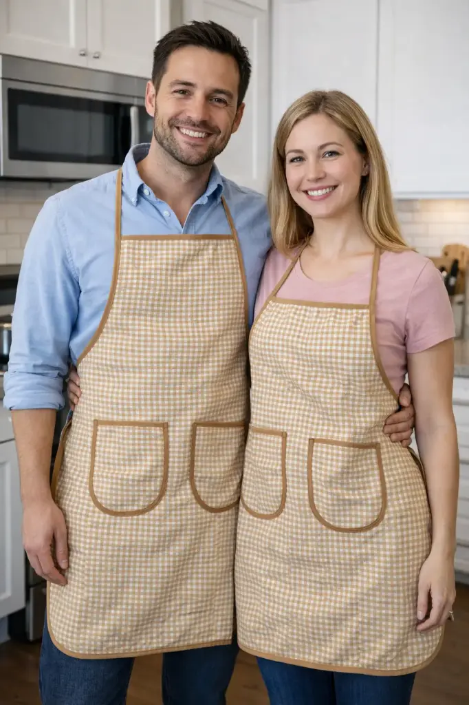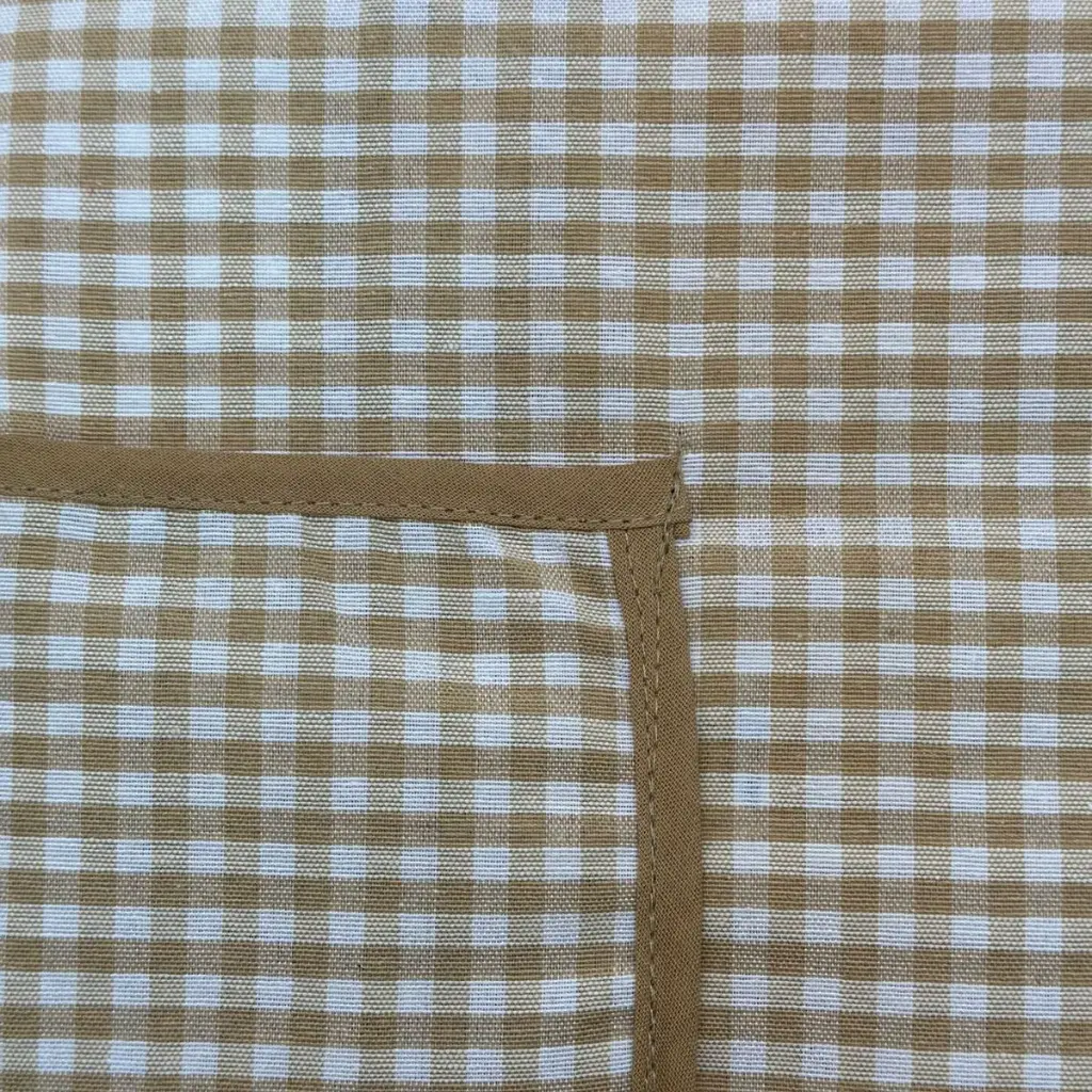 Delantal de peto estampado con cuadros vichy, con dos bolsillos frontales en la parte inferior y cuerdas para atar a la cintura y colgarlo al cuello. Cinta perimetral a tono en todo el contorno. Fabricado en España.