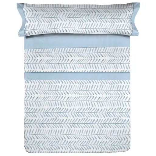 Juego de sábanas de tela modelo Becky de la marca Casa Campo. La bajera está confeccionada y la encimera, a juego con la funda de almohada, incorpora un vivo al tono junto a un estampado de ramas estilizadas dispuestas en líneas horizontales, en suaves tonos nude sobre fondo blanco, ideal para dormitorios originales.