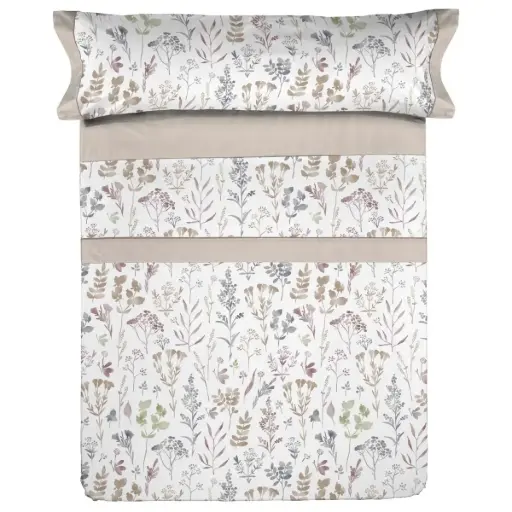 Juego de sábanas de tela modelo Damaso de la marca Casa Campo. La bajera está confeccionada, a juego con la funda de almohada, incorpora un vivo al tono junto a un estampado de ramas con hojas en diferentes tonos verdes, que aportan un toque natural al dormitorio.