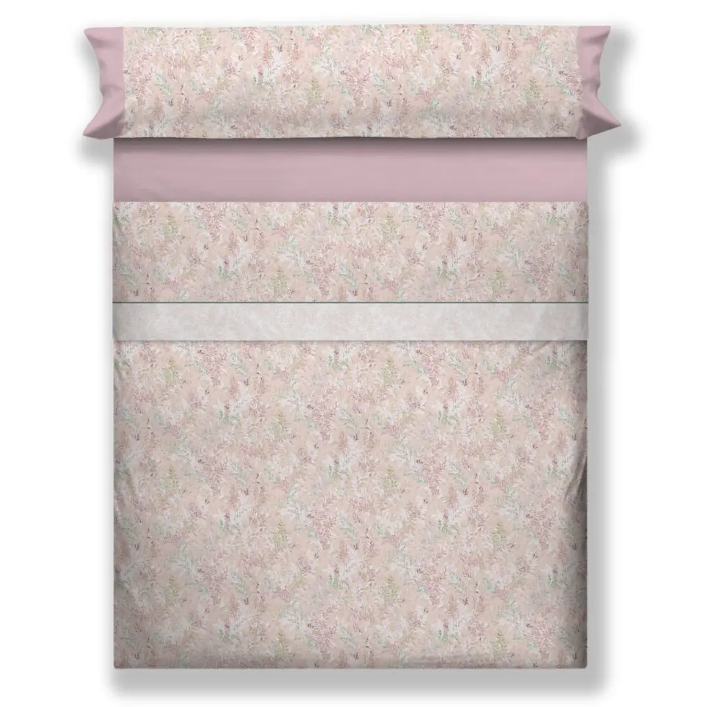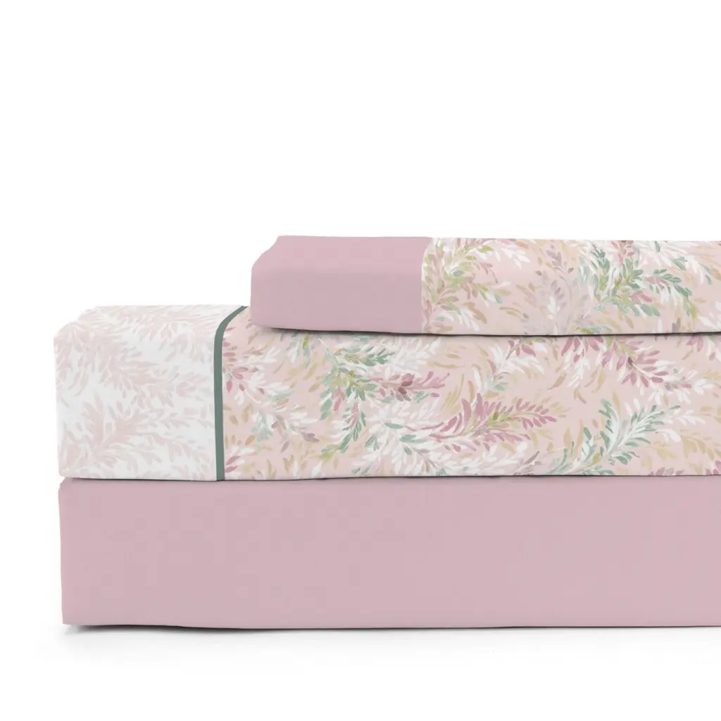 La bajera está confeccionada en color rosa. La sábana encimera a conjunto con la funda de almohada incorpora un vivo al tono junto a un estampado de delicadas ramas y hojas distribuidas de forma armoniosa sobre fondo rosita pastel. Son ideales para aportar frescura y elegancia al dormitorio.
