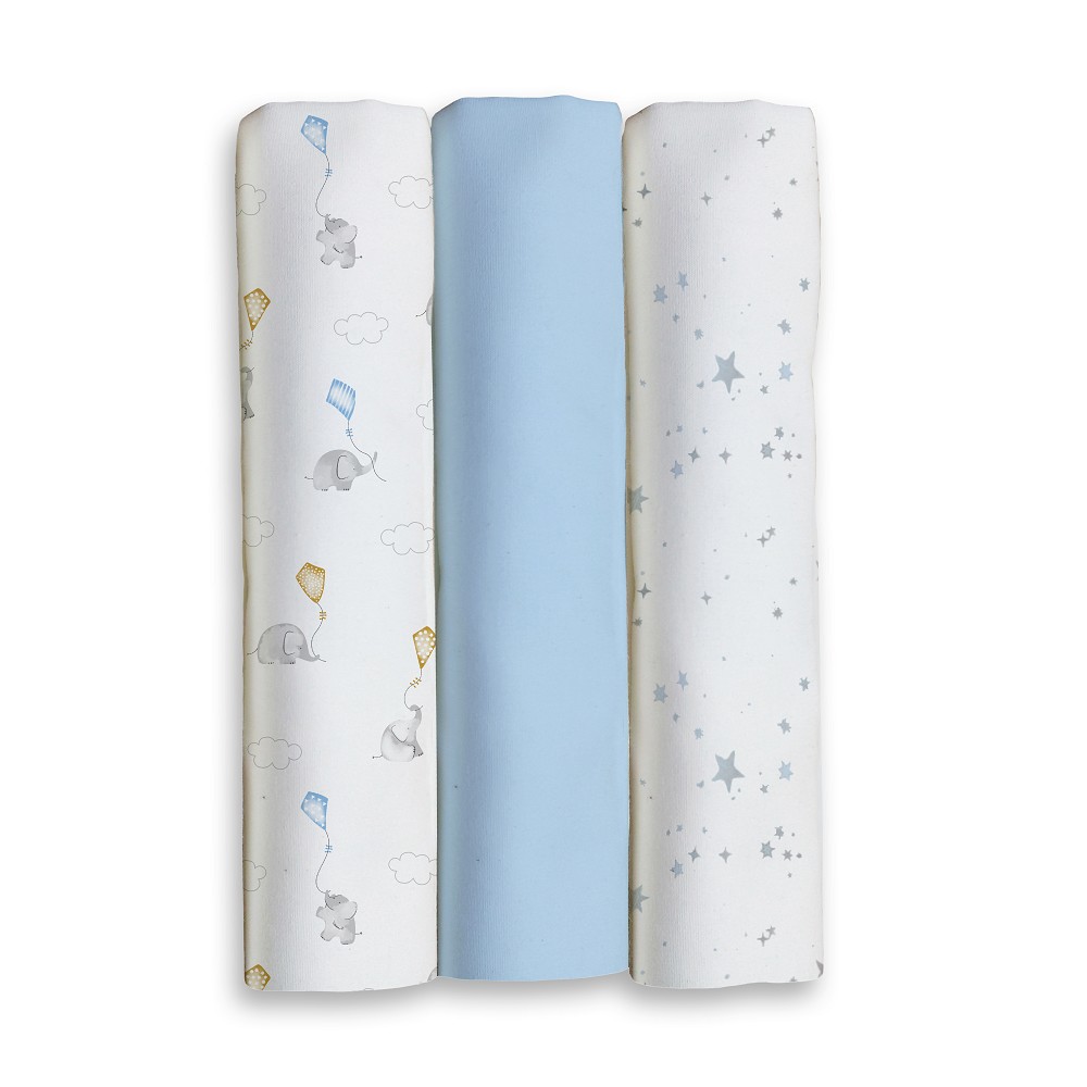 Pack de 3 gasas de algodón estampadas, modelo Conejitos Estrellas Azul, de la marca Interbaby. Un regalo muy práctico para los primeros cuidados de los recién nacidos. Incluye dos gasas estampadas (una con conejitos y otra con estrellas, ambas sobre fondo blanco) y una de color azul liso. Confeccionadas en algodón, muy suaves y absorbentes.