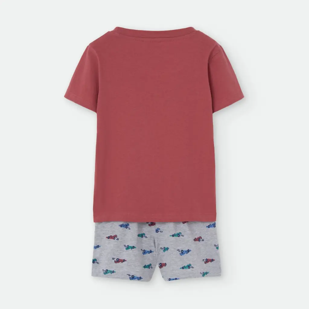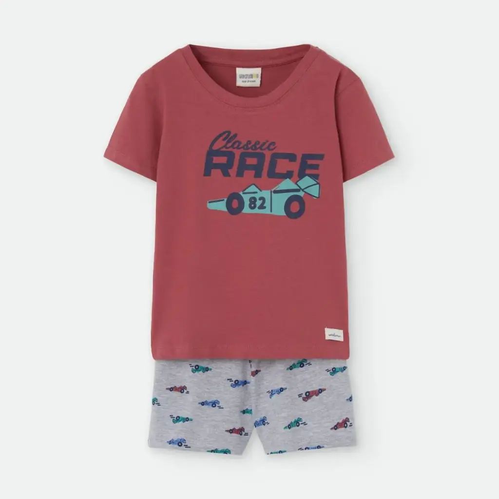 La camiseta en color rojo teja presenta cuello redondo y un estampado frontal inspirado en el mundo del motor. El short en gris jaspeado incorpora un estampado de pequeños coches de carreras en varios colores, creando un conjunto divertido. La cintura elástica facilita su colocación y aporta mayor comodidad.