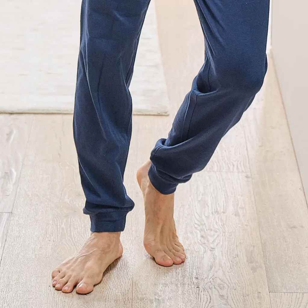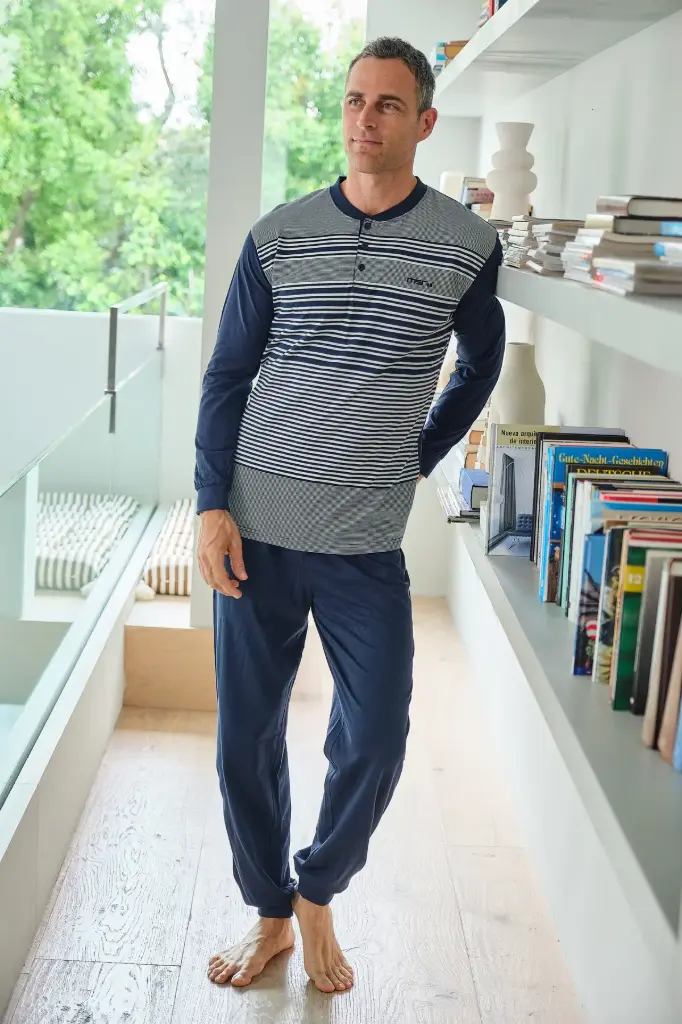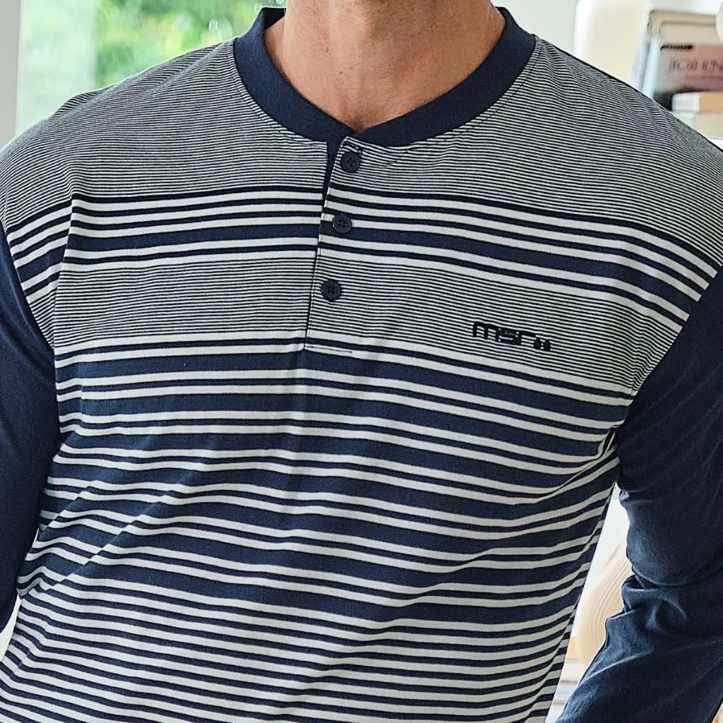 Conjunto de dos piezas compuesto por camiseta de manga larga y pantalón largo. Camiseta con estampado de rayas en color azul, cuello redondo con botones y bordado de la marca Mushler en el pecho. Pantalón largo básico de color azul. Tacto suave y agradable, tejido fresco.