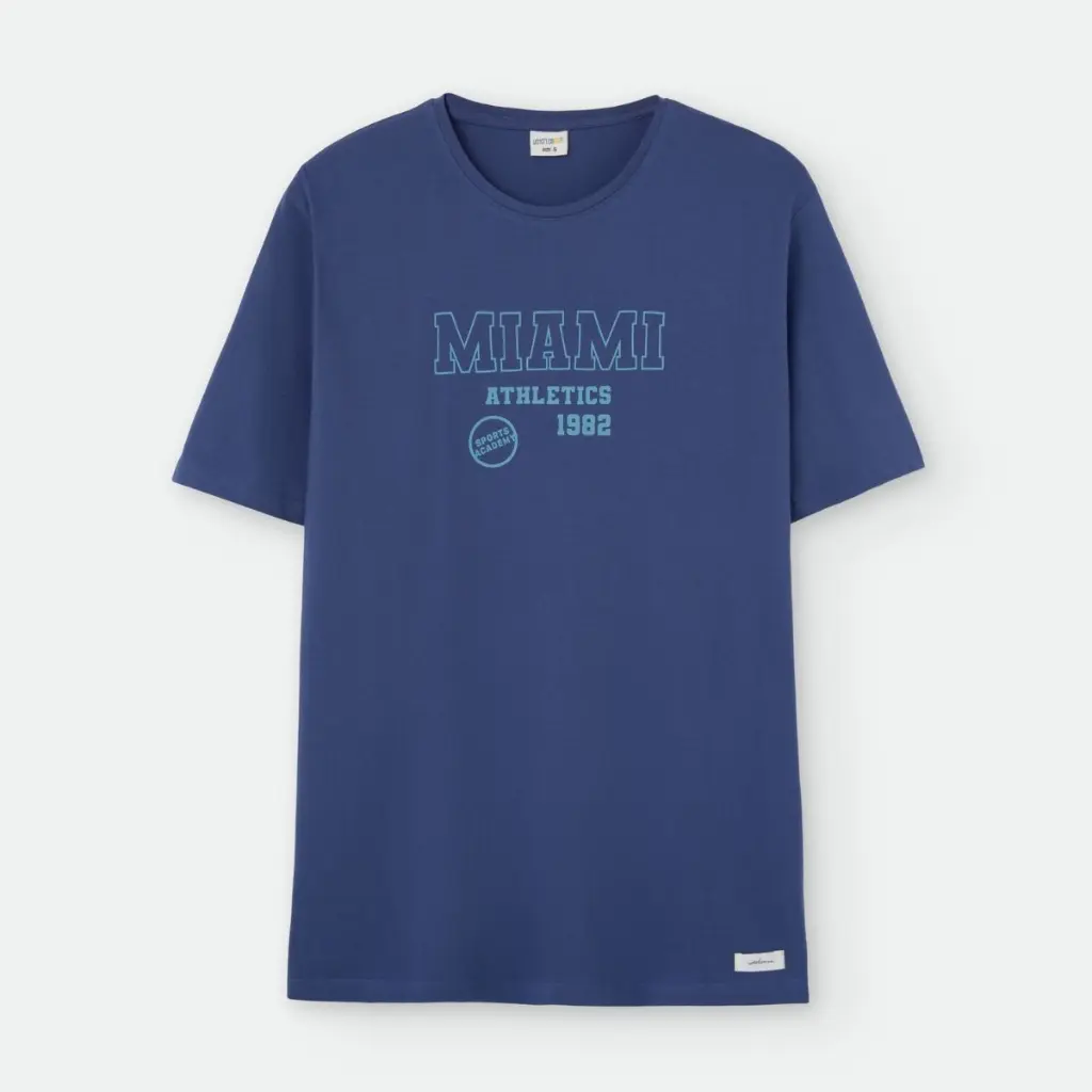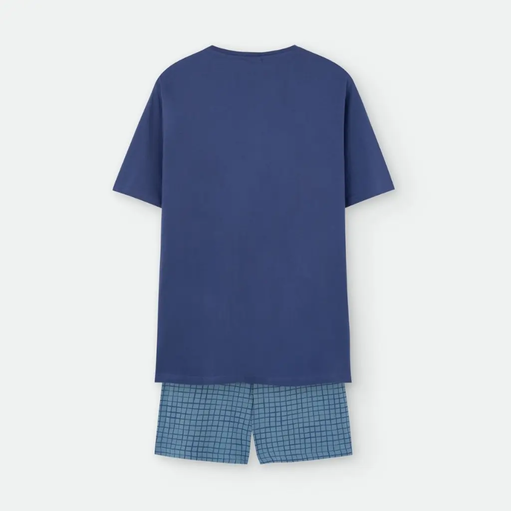 La camiseta con cuello redondo presenta en el pecho un estampado de letras «Miami». El pantalón corto, en tono azul, tiene un estampado de cuadros. Este pijama está hecho para un público jóven y atrevido.