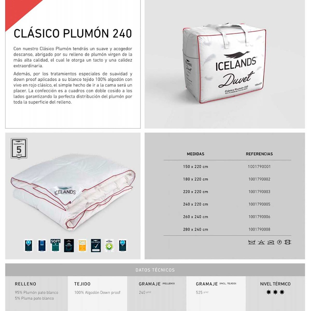 Nórdico acolchado y esponjoso ideal para utilizar en otoño o invierno. Con nuestro Clásico Plumón tendrás un suave y acogedor descanso, abrigado por su relleno de plumón virgen de la más alta calidad, el cual le otorga un tacto y una calidez extraordinaria. Además, por los tratamientos especiales de suavidad y down proof aplicados a su blanco tejido 100% algodón con vivo en rojo clásico, el simple hecho de ir a la cama será un placer. La confección es a cuadros con doble cosido a los lados garantizando la perfecta distribución del plumón por toda la superficie del relleno. El gramaje de relleno es de 240 g/m2 y el gramaje incluyendo el tejido es de 525 gr/m2.