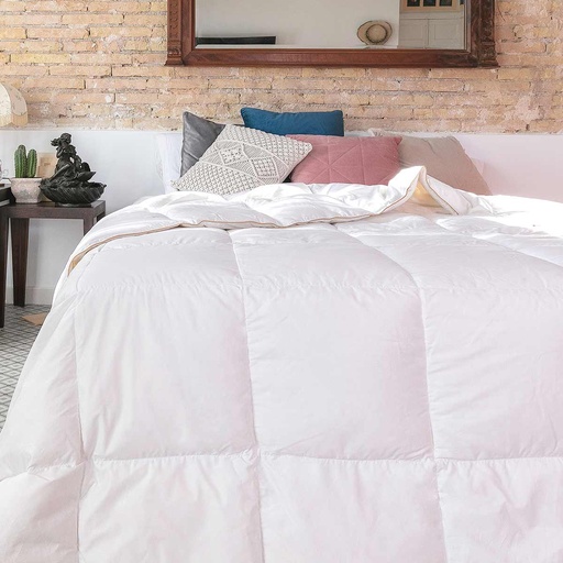 Relleno nórdico de alta calidad elaborado con 99% de plumón de oca blanca, diseñado para ofrecer un descanso cálido, ligero y confortable. Su tejido exterior de algodón 100% con 400 hilos proporciona un tacto extra suave y agradable, mientras que el relleno de plumón garantiza una excelente capacidad térmica y gran ligereza.