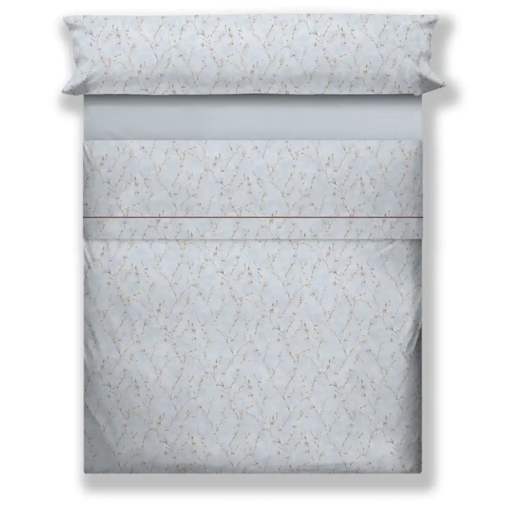 Juego de sábanas Cañete en algodón percal de 200 hilos, fresco, suave y de alta calidad. Diseño floral delicado sobre fondo azul que aporta un estilo elegante y natural al dormitorio.