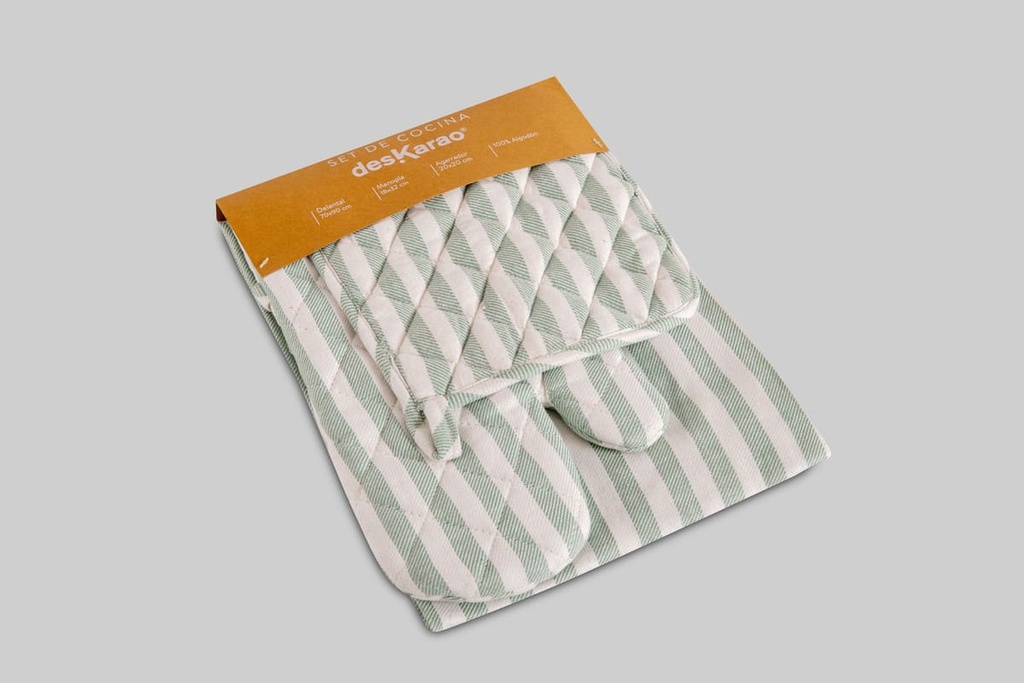 MEDIDAS: delantal 70×90 cm, manopla 18×32 cm, agarrador 20×20 cm.