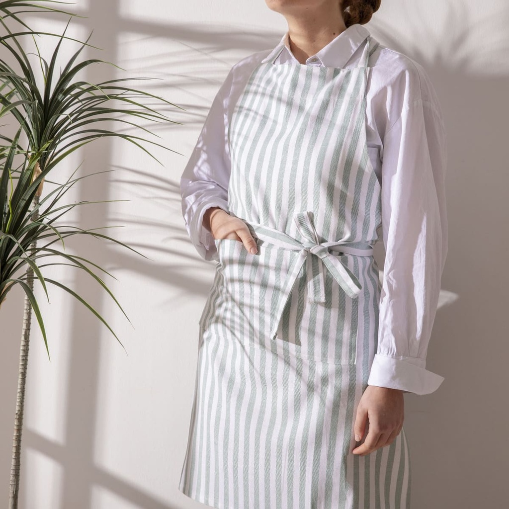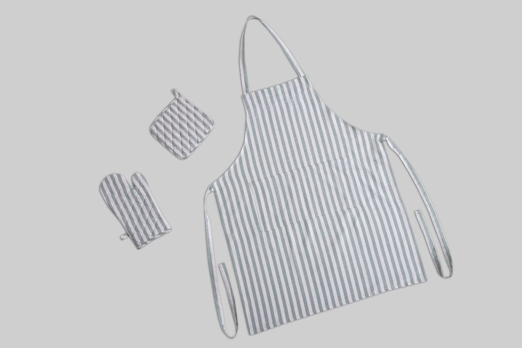 Set que incluye: manopla, agarrador y delantal de cocina. Estampados con rayas de color azul y blanco. El delantal cuenta con bolsillo y cintura ajustable. Fabricados con algodón de alta calidad.