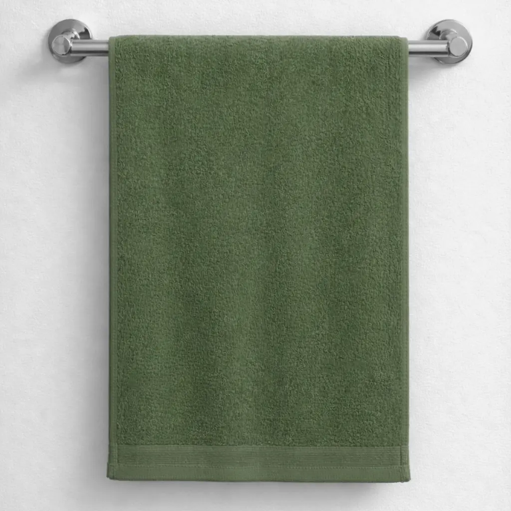 Toalla unisex confeccionada en rizo americano 100% algodón, con alta capacidad de absorción y gran durabilidad. Su tacto es suave y agradable, ideal para el uso diario. El diseño liso con cenefa en relieve aporta un toque elegante, mientras que su color verde oliva combina fácilmente en cualquier baño. Mantiene su suavidad y color tras múltiples lavados.