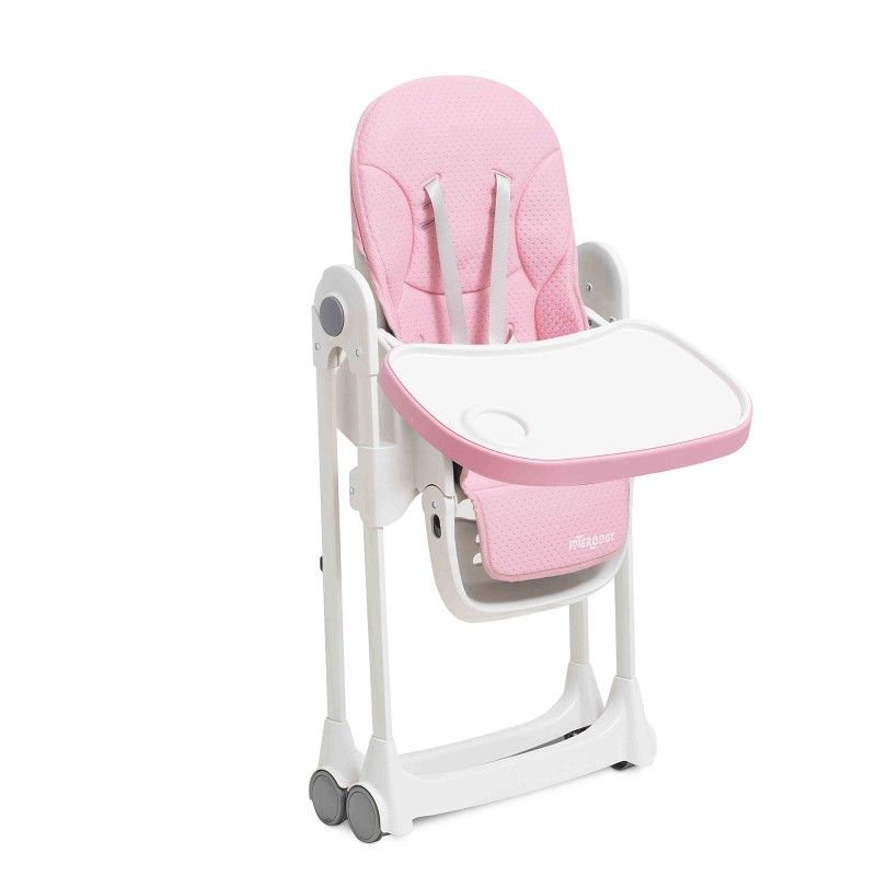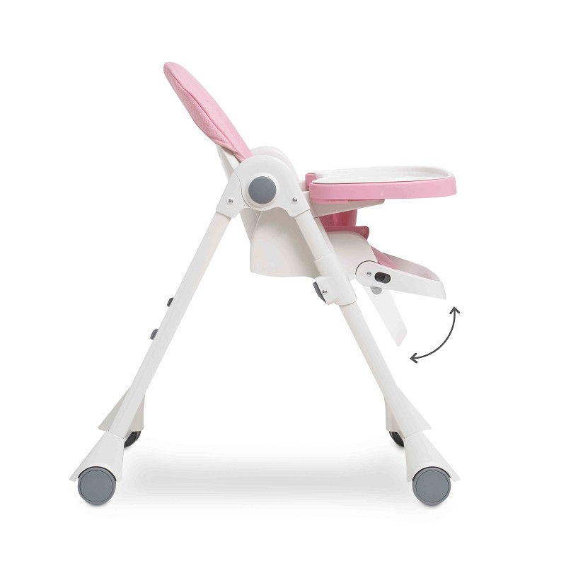 Cuenta con altura regulable, reposapiés ajustable, bandeja extraíble de fácil limpieza y arnés de seguridad de 5 puntos. Incluye ruedas para moverla con facilidad y un sistema compacto para guardarla cómodamente.